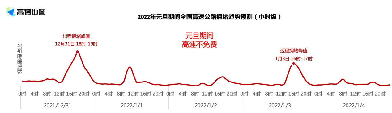 具体来说,受周五晚高峰及节前提前出行双重影响,预计2021年12月31日16时-20时全国高速出现出行高峰,峰值时段是18时-19时;返程高峰是2022年1月3日15时-19时,峰值时段是16时-17时。