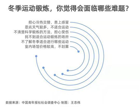 调查显示,对于冬天运动锻炼面临的难题,38.2%的受访者觉得是找不到适合运动锻炼的场所,35.5%的受访者觉得是不了解冬季适合进行哪些运动,11.6%的受访者认为室内场馆价格较高,不划算。