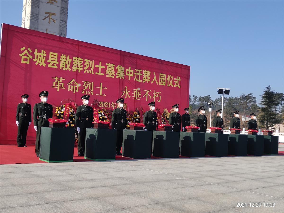 青山埋忠骨,苍松慰英灵。12月29日,湖北谷城县举行首批烈士墓集中迁移安葬仪式,将谷城早期县委领导人李亚声等42名分散安葬的烈士集中迁入县烈士陵园安葬,进行统一保护管理和纪念瞻仰,告慰英烈忠魂,激励子孙后代。谷城县主要领导,100多名烈士亲属代表、县直有关单位干部职工代表、驻谷部队和武警官兵、县消防救援代表、功勋模范退役军人代表、师生代表等为烈士送行。