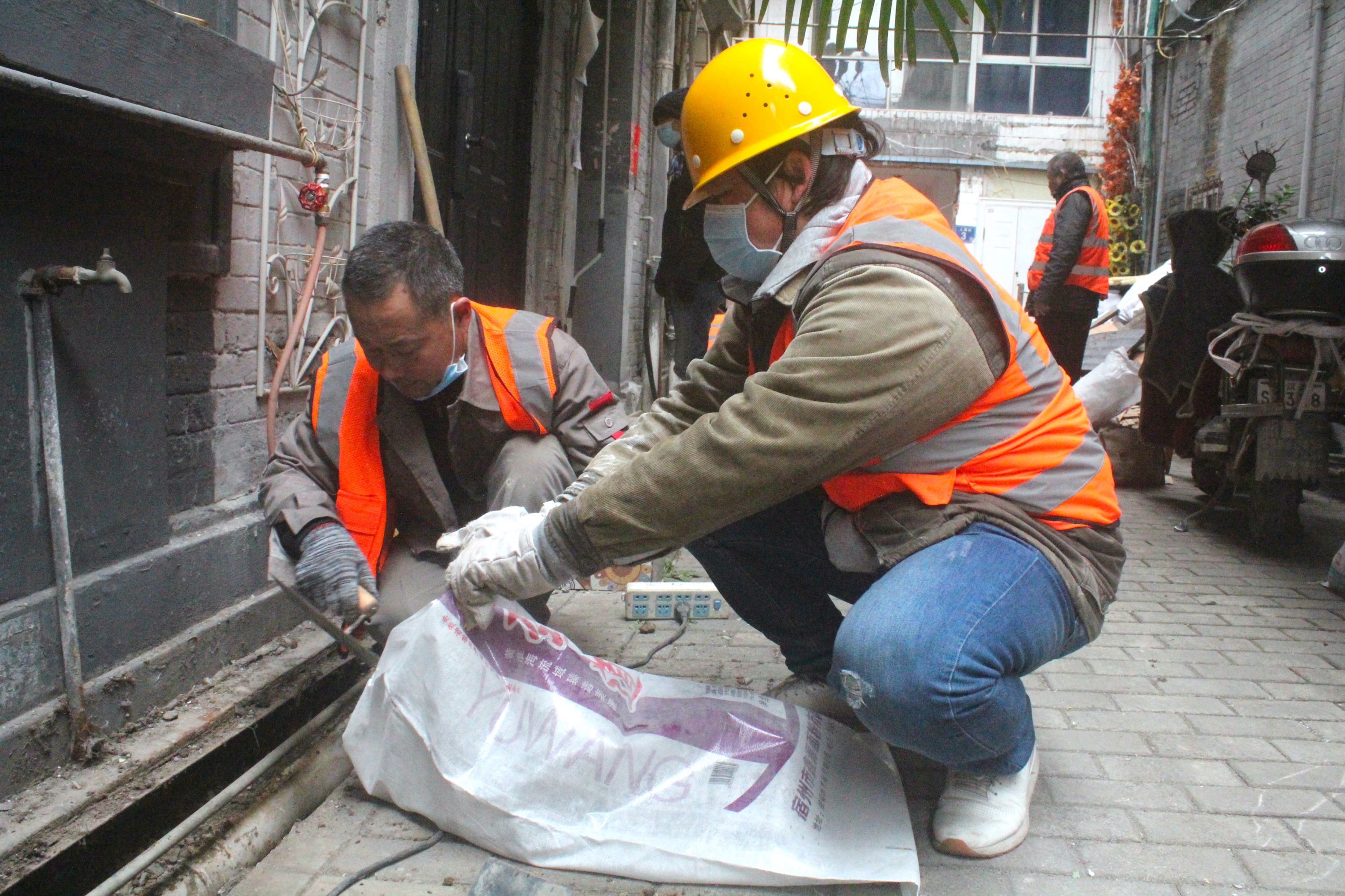 工作人员清理上海邨街区排水管网里的淤泥。