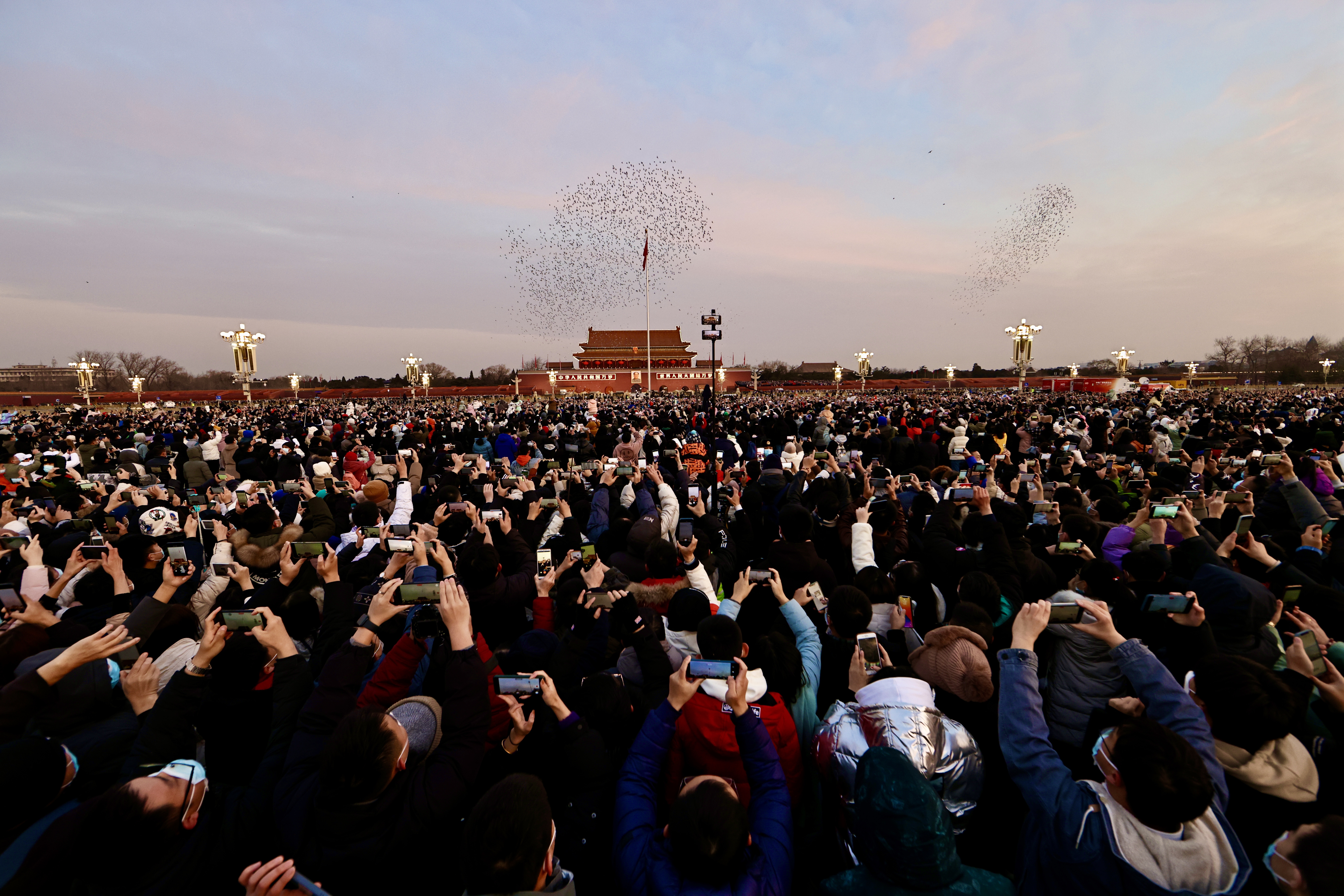 1 月 1 日清晨,和平鸽飞过北京天安门广场上空。 中国日报记者 朱兴鑫 摄