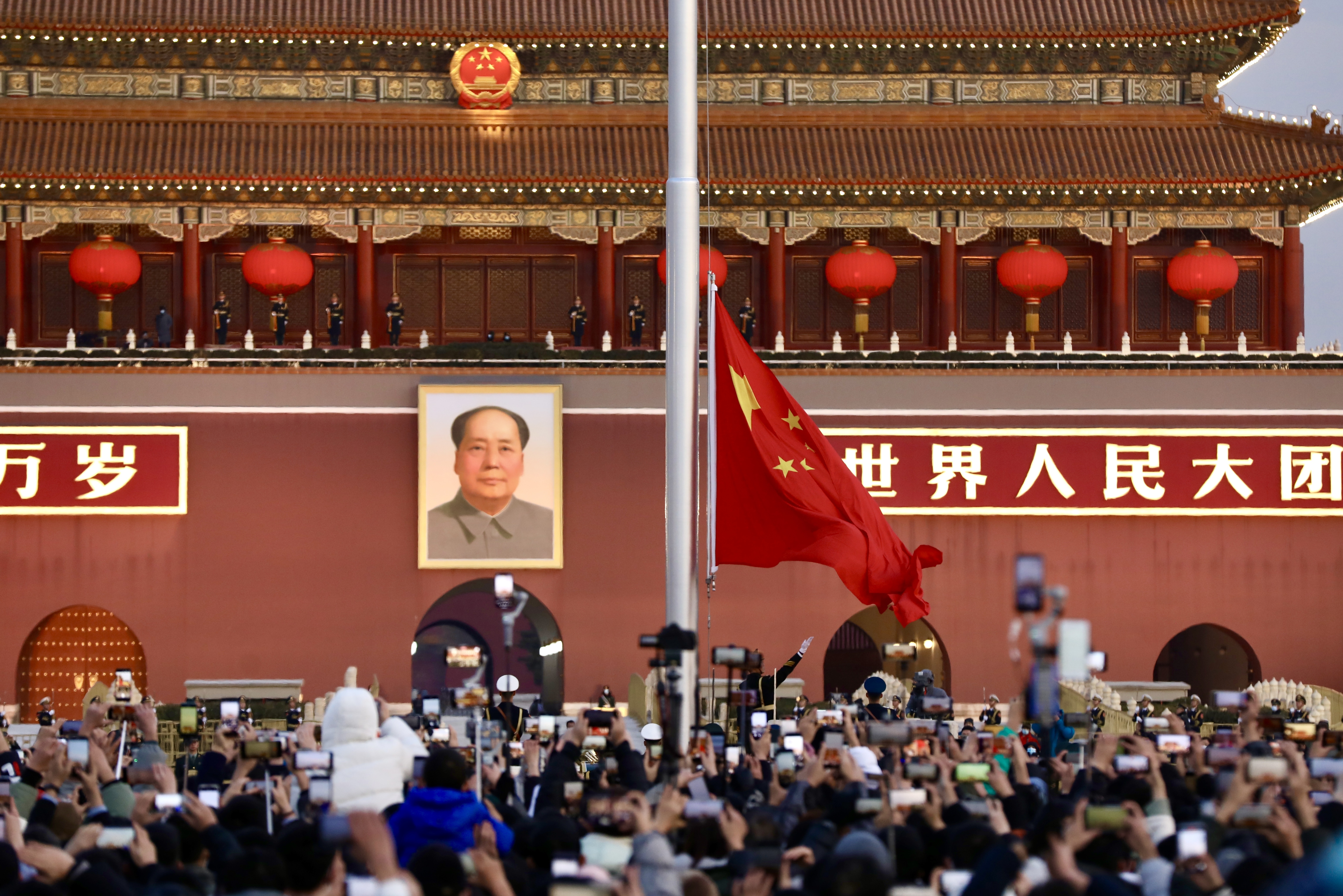 1 月 1 日清晨,游客在北京天安门广场拍摄新年首场升国旗仪式。 中国日报记者 朱兴鑫 摄