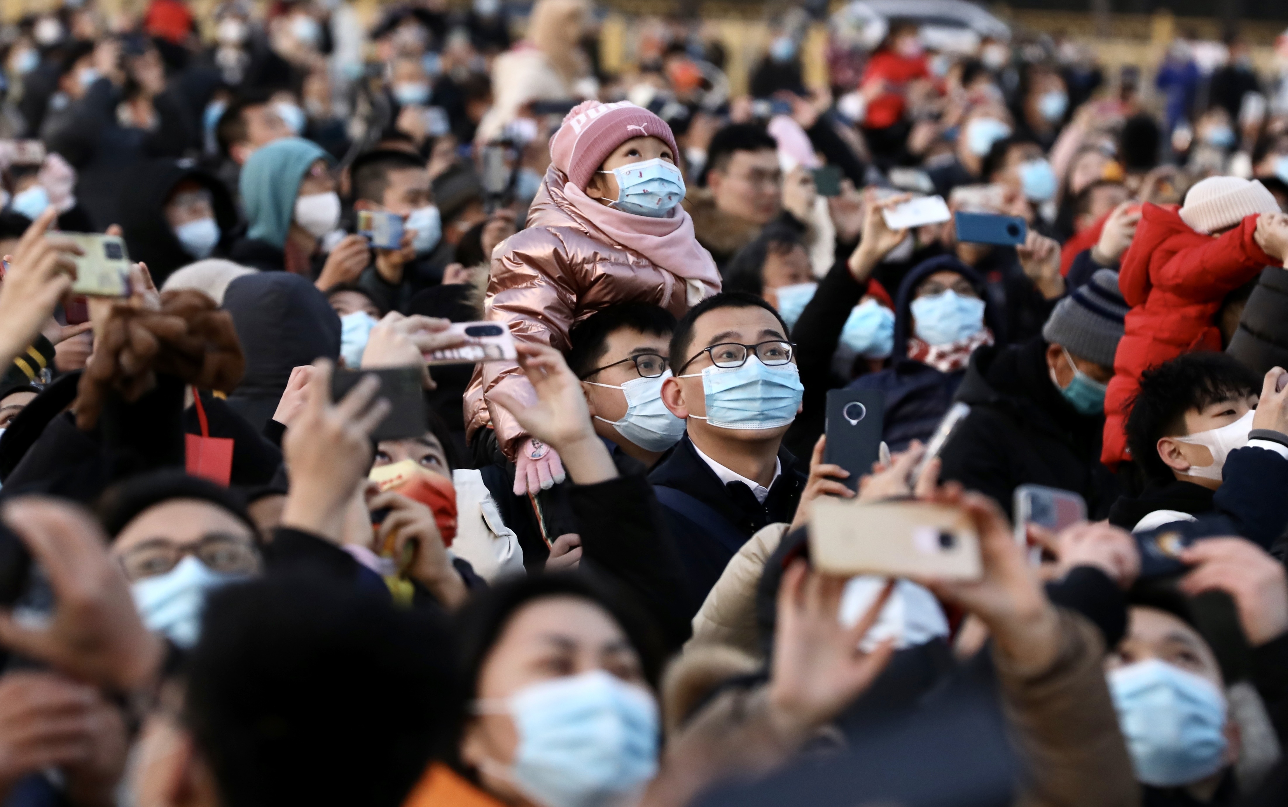 1 月 1 日清晨,游客在北京天安门广场观看新年首场升国旗仪式。 中国日报记者 朱兴鑫 摄