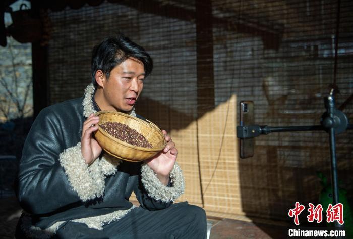洛桑在镜头前介绍家乡特产。 刘忠俊 摄