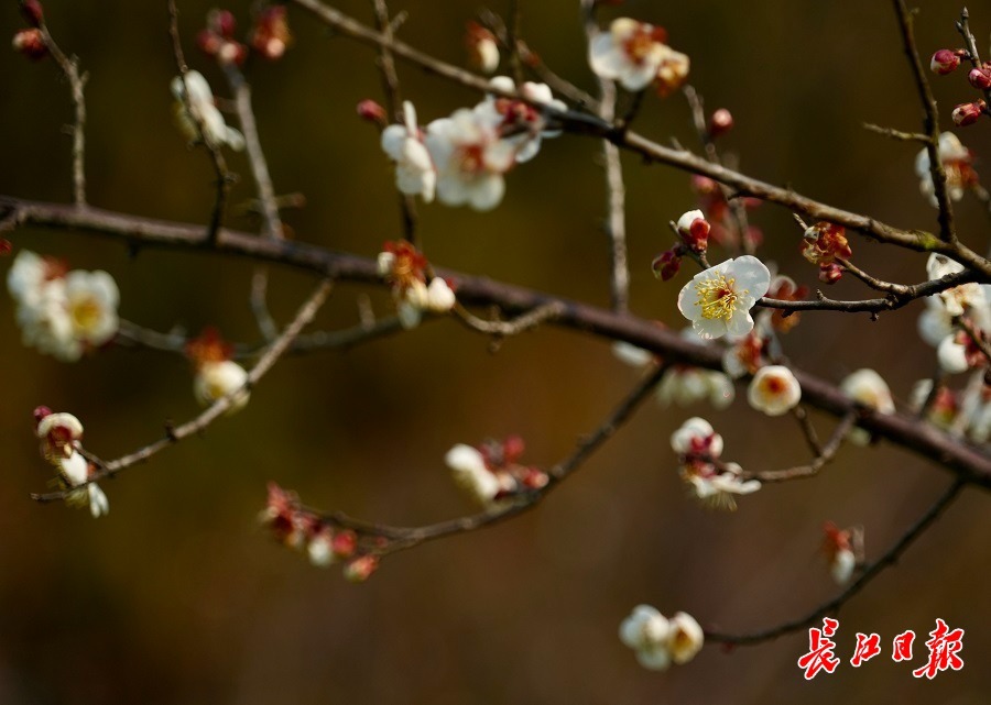 “按照往常惯例,元旦一般蜡梅盛放,梅花开放时间稍晚一些,但今年出现了奇特的现象。”中国梅花研究中心高级工程师江润清告诉长江日报记者,由于前期天气温暖干燥,目前园内蜡梅处于初开时期,梅花早花品种磨山早红、江梅等却提前盛放在少量梅花树枝头了,“目前来到东湖梅园,游客可欣赏到狗牙蜡梅、素馨蜡梅等蜡梅品种,也能邂逅部分梅花早花品种,预计园内蜡梅将于1月中旬迎来最佳观赏期。此外。中国梅文化馆内展出有蜡梅盆栽、写意盆景展,游客也可前往观赏。”