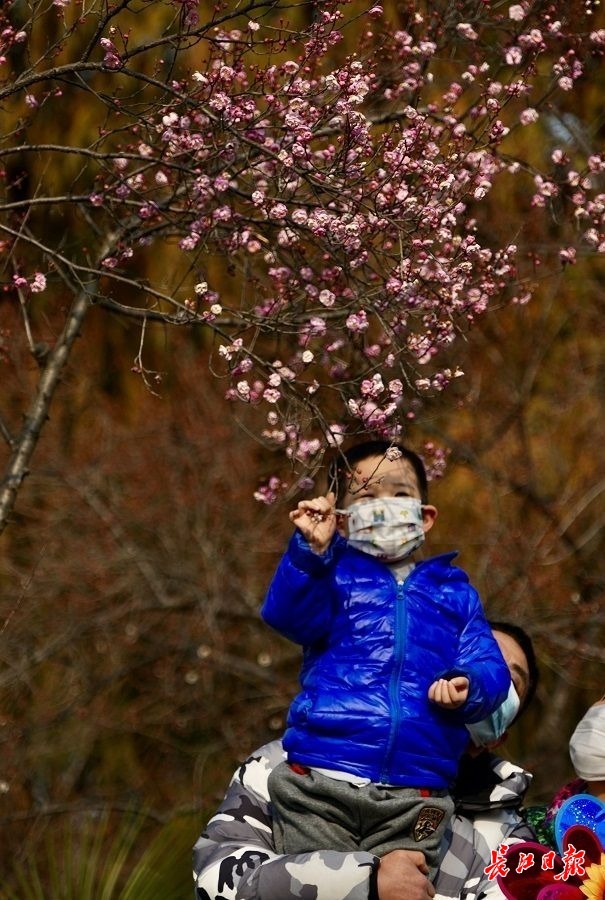 磨山早红梅花树下,谭志来抱着4岁的孙儿小亿凑近闻着花香,“墙角数枝梅,凌寒独自开。遥知不是雪,为有暗香来。”小亿摇头晃脑背起诗文,引得周边游客连连点赞、阵阵欢笑。谭志来说,自年轻时就对东湖梅园有情怀,如今新年第一天带着小孙儿来到这里,希望他从小能领悟梅花精神,热爱生活、昂扬向上。