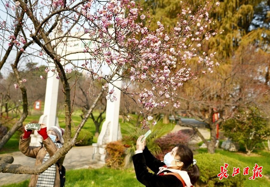 1日,东湖梅园正式开园,部分梅花绽放迎来游客驻足拍照。长江日报记者何晓刚 通讯员邹卉 摄