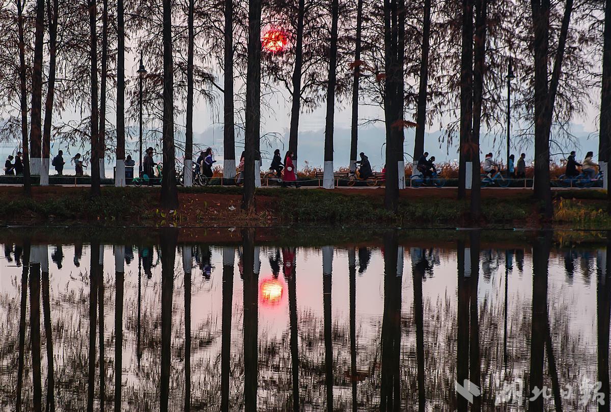 1月2日,许多游人在武汉东湖绿道骑行、跑步、散步、看日落。每当落日西下,东湖绿道是市民健身的好地方,这里的落日夕阳,给健步走的市民增加几分欢喜。逛东湖绿道已成为武汉人幸福生活的一部分。(湖北日报全媒记者 朱熙勇 通讯员 周慧 摄)