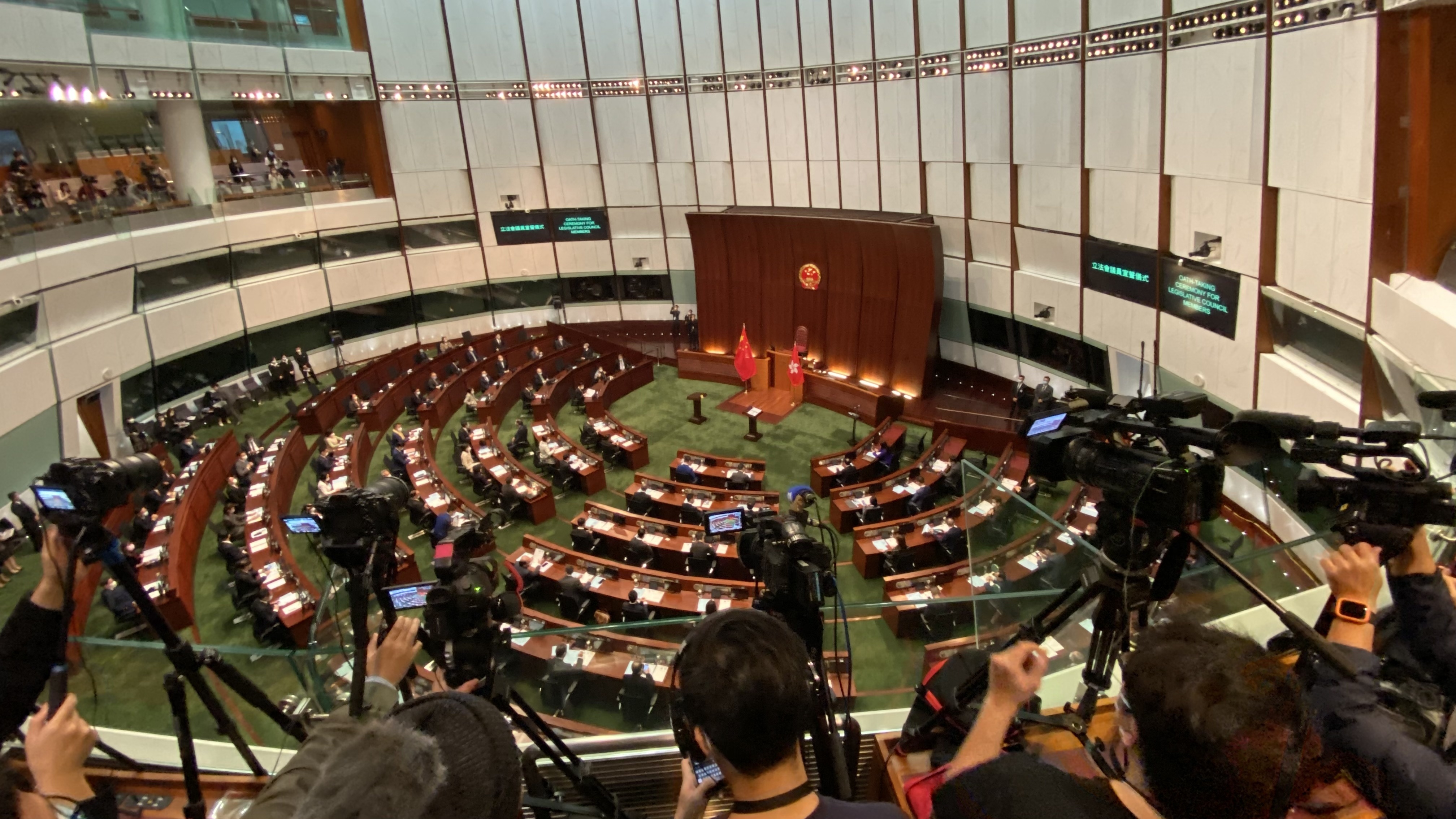 根据程序,候任议员要面向国旗和区旗肃立,奏唱国歌,再逐一到台前宣誓。宣誓仪式完成后,特区政府会公布宣誓有效的立法会议员名单。