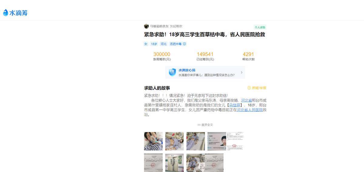 河北邢台威县18岁女孩萌萌被姐夫投毒百草枯(图源:水滴筹)