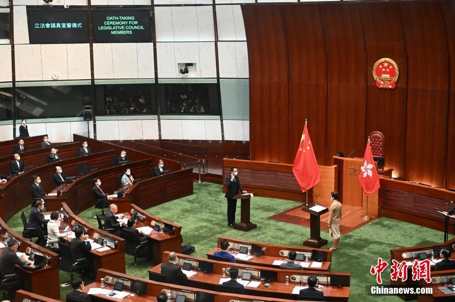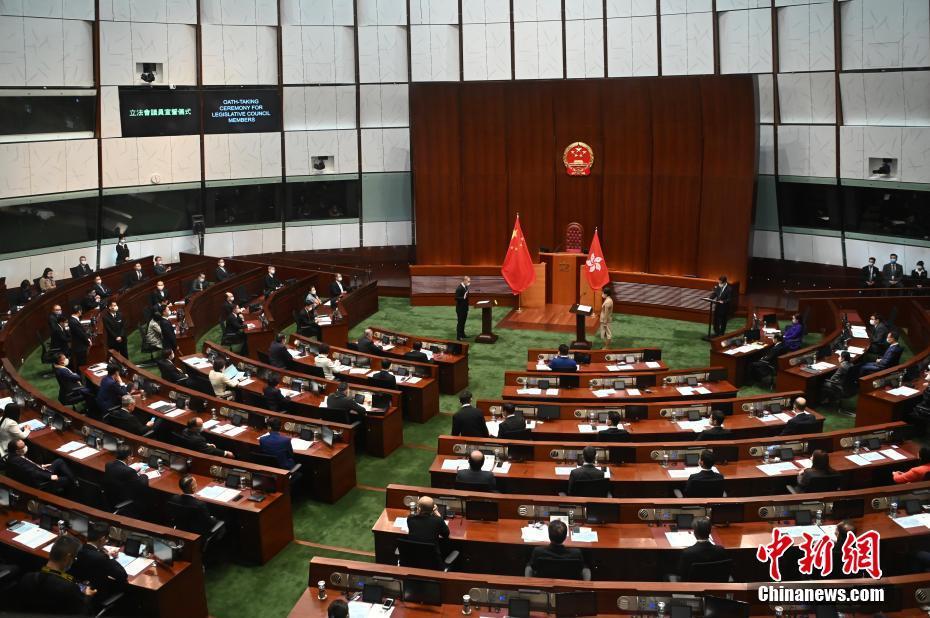 1月3日上午,香港特区第七届立法会已依法组成,新当选的立法会90名议员在行政长官监誓下完成宣誓。图为宣誓仪式。 中新社记者 李志华 摄