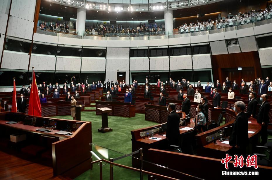 1月3日上午,香港特区第七届立法会已依法组成,新当选的立法会90名议员在行政长官监誓下完成宣誓。图为宣誓仪式前奏唱国歌。 中新社记者 李志华 摄