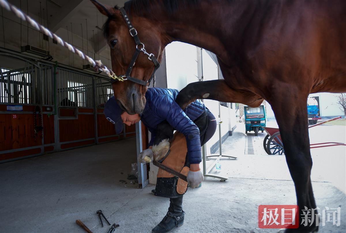 元月3日上午,武汉商学院马术学院马房内迎来了两位钉马蹄铁的师傅,全幅武装的师徒俩,熟练地给校内教学马匹的马掌修剪、打磨,然后钉上马蹄铁,给这里的马匹穿上了“新鞋”。