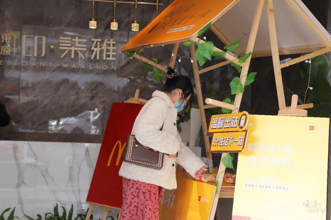 早上七点半,在交警大队、公交总站、环卫工人集合点以及多处地铁口,都设置了东原印·柒雅暖冬早餐派送点。当一份份用心打包的麦当劳早餐包,被送到可敬可爱的“城市唤醒人”手里,回报我们的是一个个真诚的笑容。