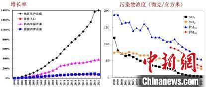 图为1998年以来北京市地区生产总值、常住人口等与各项污染物浓度变化趋势。 北京市生态环境局供图