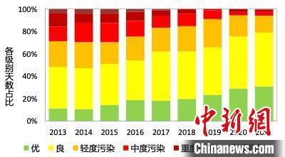 图为2013-2021年空气质量各级别天数分布。 北京市生态环境局供图