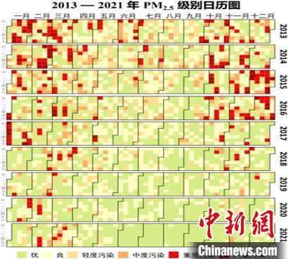 图为2013-2021年PM2.5级别日历图。 北京市生态环境局供图