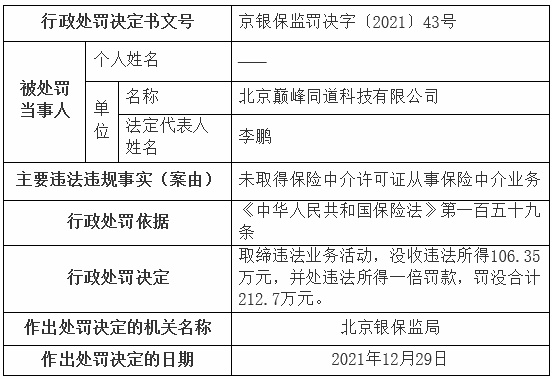 中国经济网北京1月4日讯 银保监会网站近日披露的北京银保监局行政处罚信息公开表(京银保监罚决字〔2021〕43号)显示,北京巅峰同道科技有限公司未取得保险中介许可证从事保险中介业务。北京银保监局依据《中华人民共和国保险法》第一百五十九条,对该公司作出如下行政处罚:取缔违法业务活动,没收违法所得106.35万元,并处违法所得一倍罚款,罚没合计212.7万元。