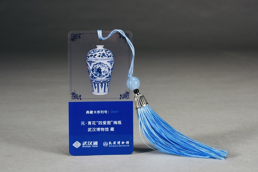 此次联合推出的“元青花四爱图梅瓶”书签武汉通卡,取材于四爱图之一的“林和靖爱梅鹤”主题,整体呈现小轩窗设计,透明的卡片底色让人仿若身临其境在博物馆欣赏梅瓶一般,色泽、图案上完美复刻梅瓶的细节,极具收藏价值。