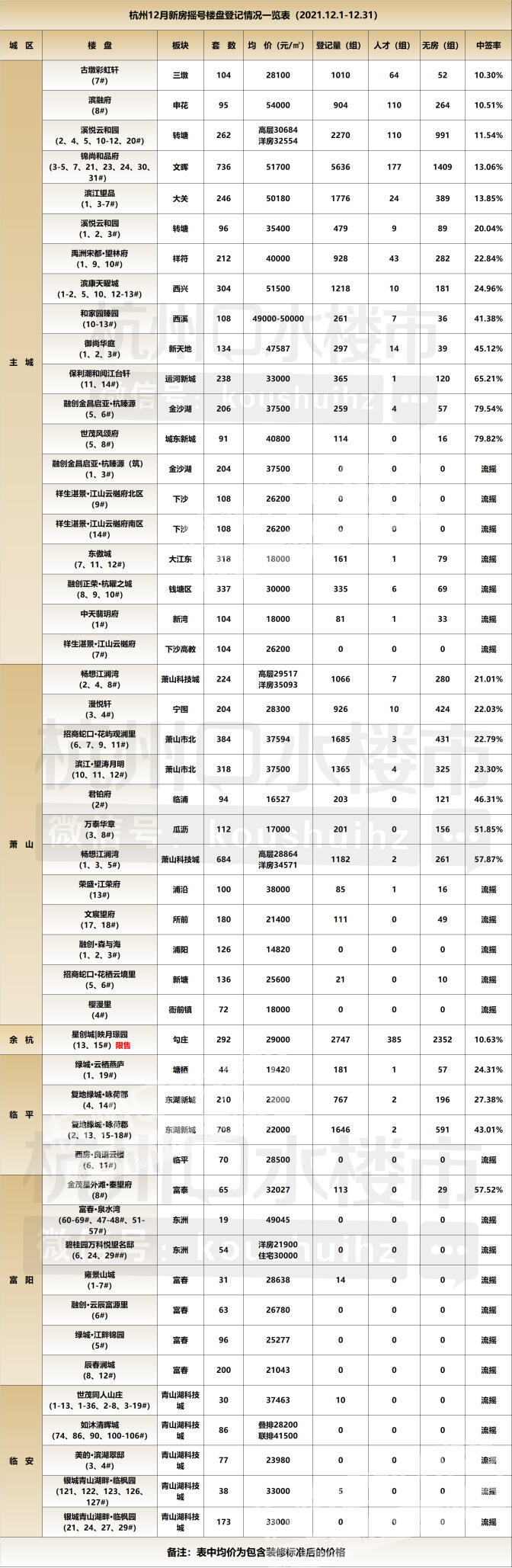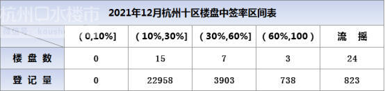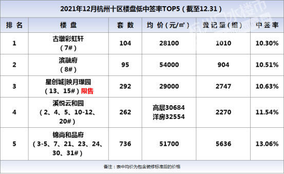 从数据上看,12月中签率最低的依旧是“古墩彩虹轩”,已经连续两个月蝉联“低中签率TOP1”。11月以9.90%的中签率进入限售,12月以10.30%又无需限售。