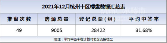 浙江在线-住在杭州网1月4日讯(浙江在线记者 吴承宇)据统计,截至12月31日,杭州12月登记摇号楼盘49次,9005套摇号房源入市,共计28422户家庭参与/入围摇号,平均中签率31.68%,环比11月的25.16%,上升了6.42%,摇号难度下降。
