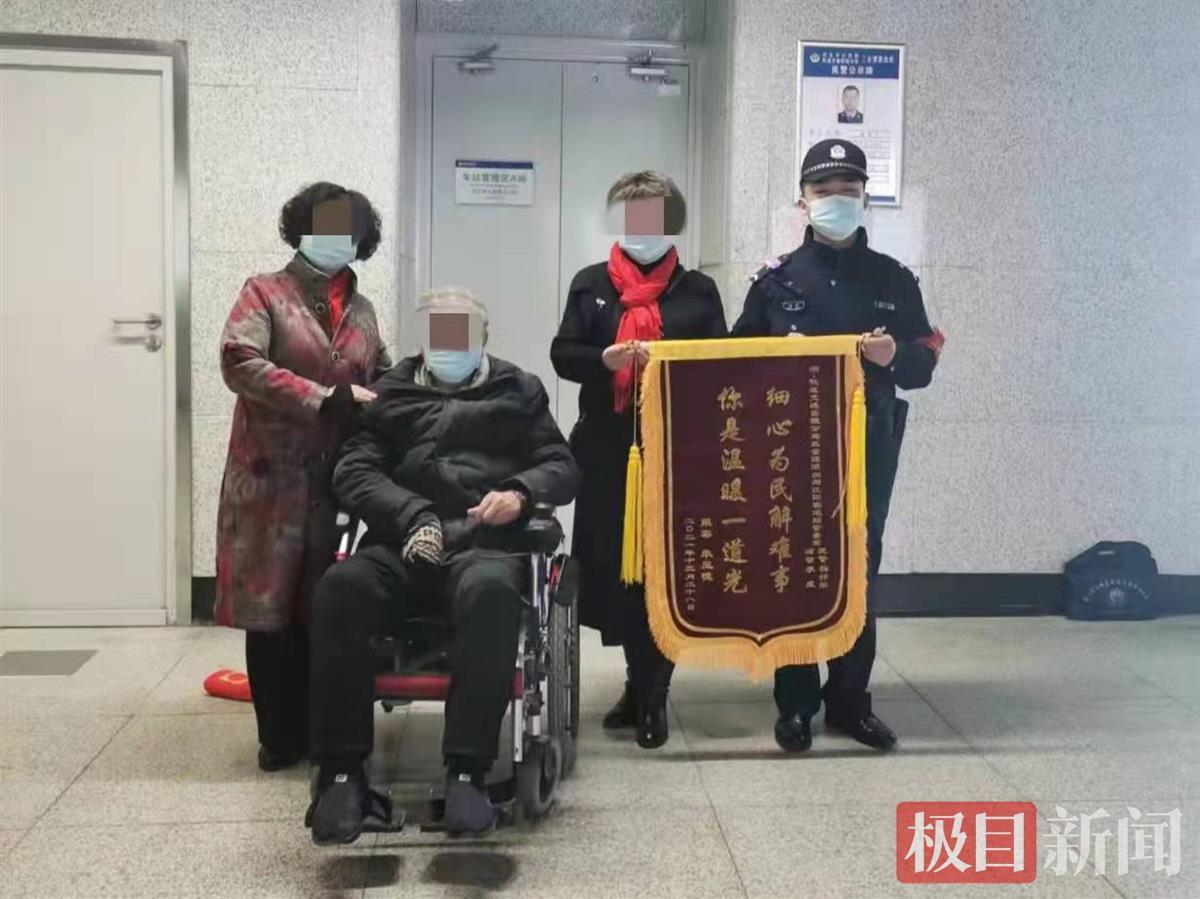 1月2日下午,武汉地铁3号线汉阳客运站警务室来了三位特殊的乘客:两位女士推着坐在轮椅上的七旬老人朱爹爹,特意送来一面印有“细心为民解难事 你是温暖一道光”的锦旗,不住地向该站地铁警察表示感谢。