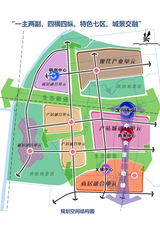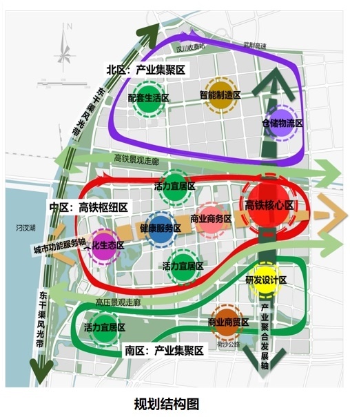 而B设计方案中,汉川市沿江高铁汉川东站片区,北至武荆高速、南至荷沙公路、西至东干渠、东至福星路,规划用地面积约29.39平方公里。该项目为汉川市东站片区,未来将承担汉川门户区域空间拓展的重任,它的崛起将创造汉川城市发展新的增长极。其中,北区为产业集聚区,包括智能制造、现代物流区、活力居住区等;中区为高铁枢纽区,包括高铁核心区、商务办公、商业酒店等综合服务区、健康服务区、活力居住区、文旅产业区等;南区为产业集聚区,包括研发核心区、商业商贸区、活力居住区等。