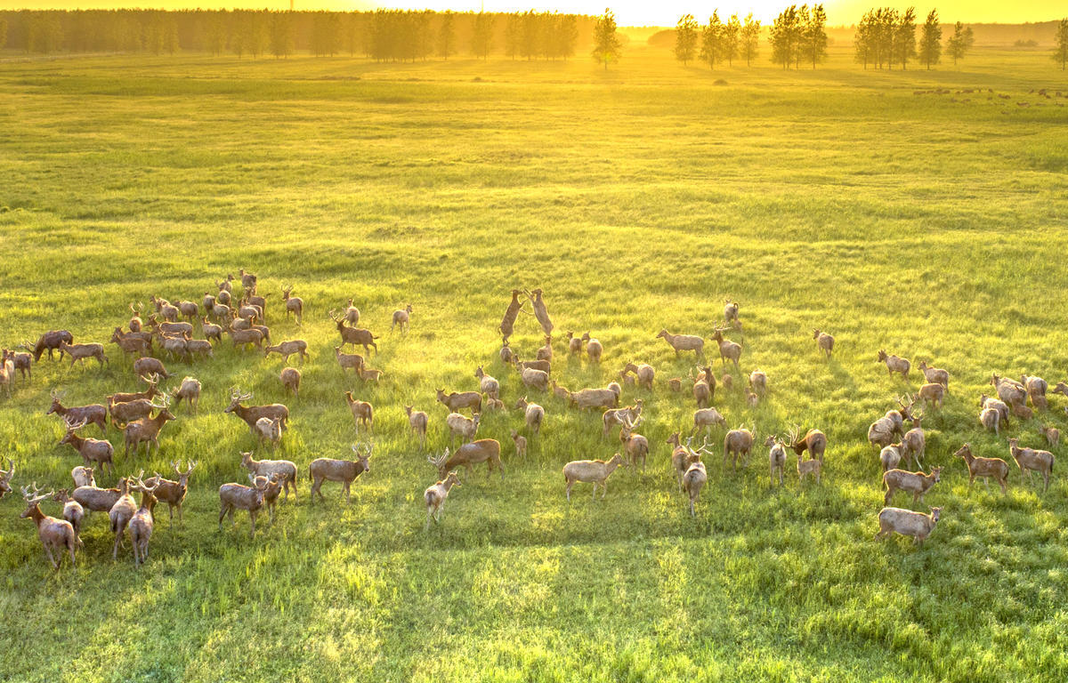 石首麋鹿自然保护区,麋鹿在草地上栖息、觅食。石首麋鹿家族繁衍至2300余头,成为目前世界上最大的麋鹿野生种群,被联合国教科文组织称赞为“全球濒危物种保护的成功范例”。(湖北日报全媒记者 柯皓 摄)