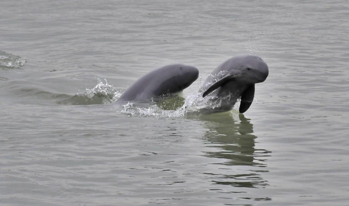 一群江豚在长江宜昌城区江段葛洲坝下游大江航道水域时而跃出水面。(湖北日报全媒记者 刘曙松 摄)