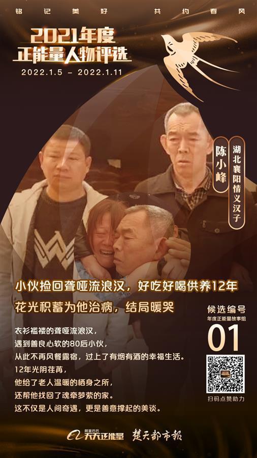 新年伊始,掌声和敬意献给比春风更温暖的平凡人。2021年12月底,阿里巴巴天天正能量联合本报及全国近百家主流媒体,启动了2021年度正能量人物评选,面向全社会征集候选案例。连日来,经过广大网友和各地媒体推荐,全国100组候选案例已经出炉,本报推荐的陈小峰成功入围候选。1月5日0点,评选投票将正式拉开帷幕,一起为他们点赞助力,让湖北正能量在新的一年绽放更耀眼的光芒。