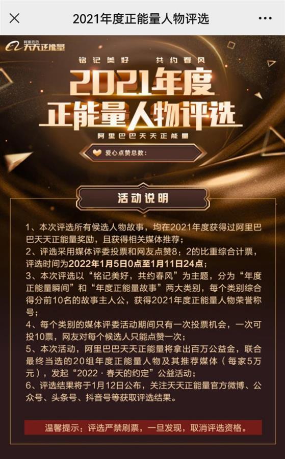 每逢岁末年初,阿里巴巴天天正能量发起的“年度正能量人物评选”都将如约开启,今年已是第五年。本届评选的主题为“铭记美好,共约春风”,主要聚焦2021年天天正能量曾奖励过的1000多个凡人善举,从中筛选出最具代表性的案例参与评选。