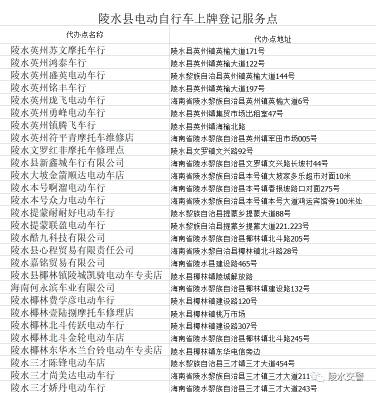 1月1日起,陵水在全县范围内启动电动自行车上牌工作。50个服务点工作时间为每天8:30-17:30,广大群众可以选择通过“海南交警”微信公众号网上预约,或到就近的网点现场办理电动自行车上牌服务。