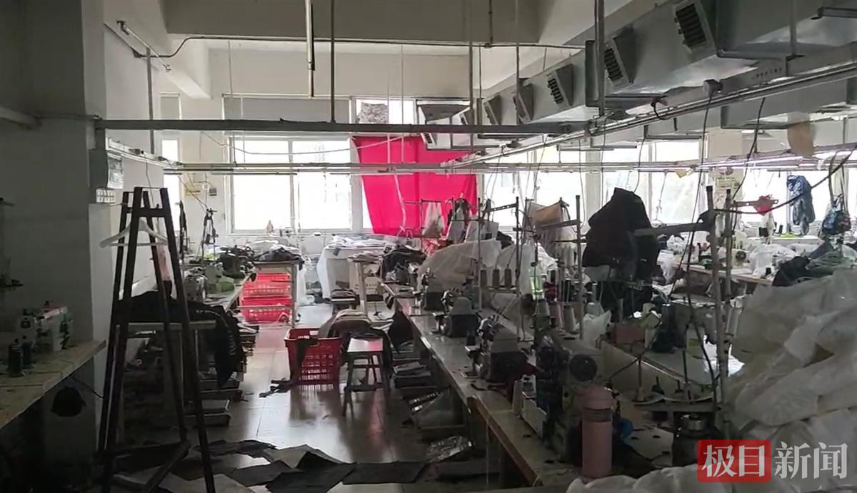 1月2日,接到樊先生反映的问题后,极目新闻记者当日就赶至涉事公司——武汉市黄陂区横店顺昌科技产业园武汉迪可唛服饰有限公司。记者上到该公司二楼,因元旦放假,整个楼层只有三四个人在留守。现场摆放着一排排缝纫设备,地上到处可见随意丢弃的布料。
