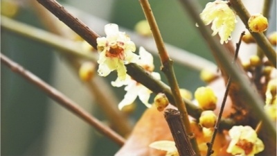 中山公园里的蜡梅林里,淡黄色的蜡梅在寒风中绽放。