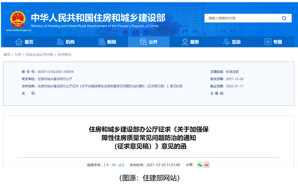 2021年12月30日,为扎实推进保障性住房建设决策部署,进一步提升工程质量,住建部办公厅就《关于加强保障性住房质量常见问题防治的通知(征求意见稿)》征求意见。