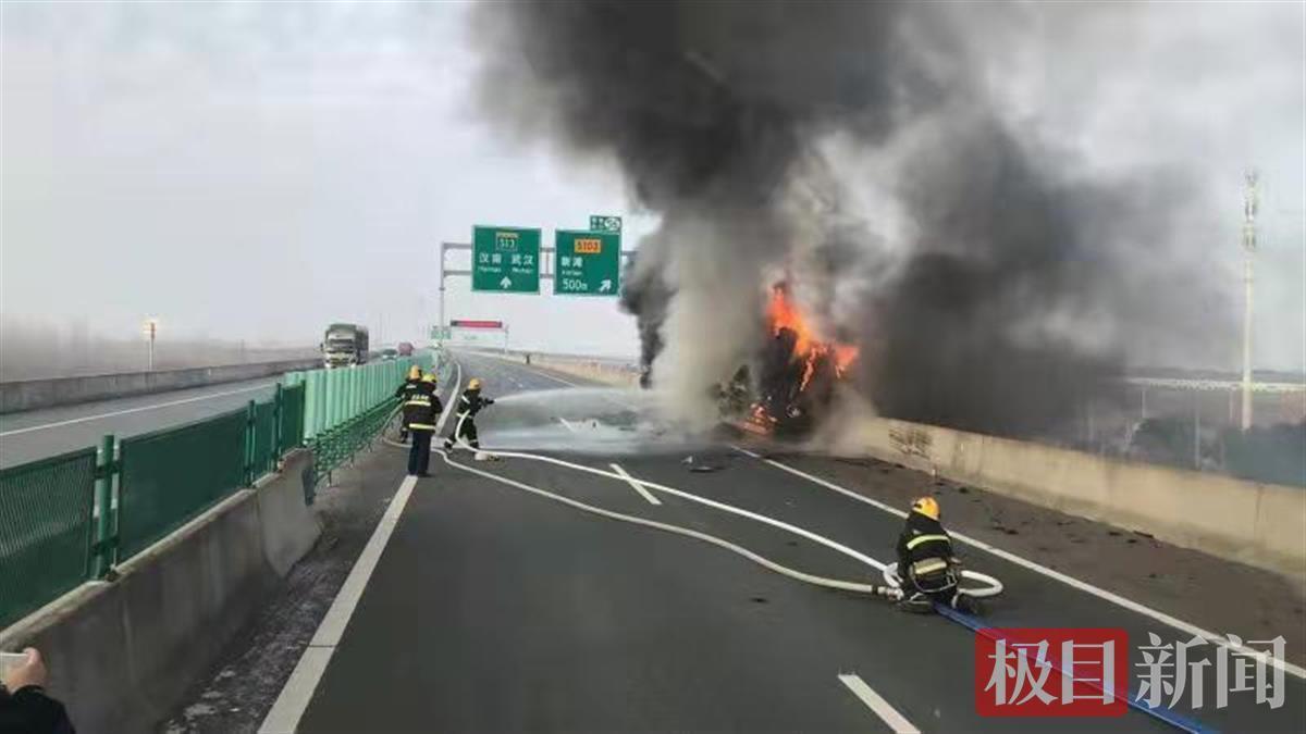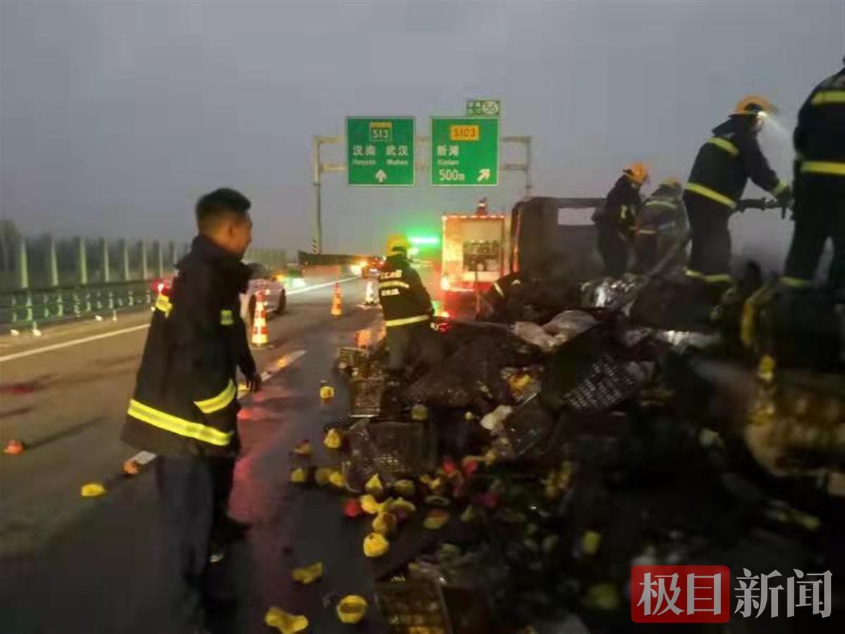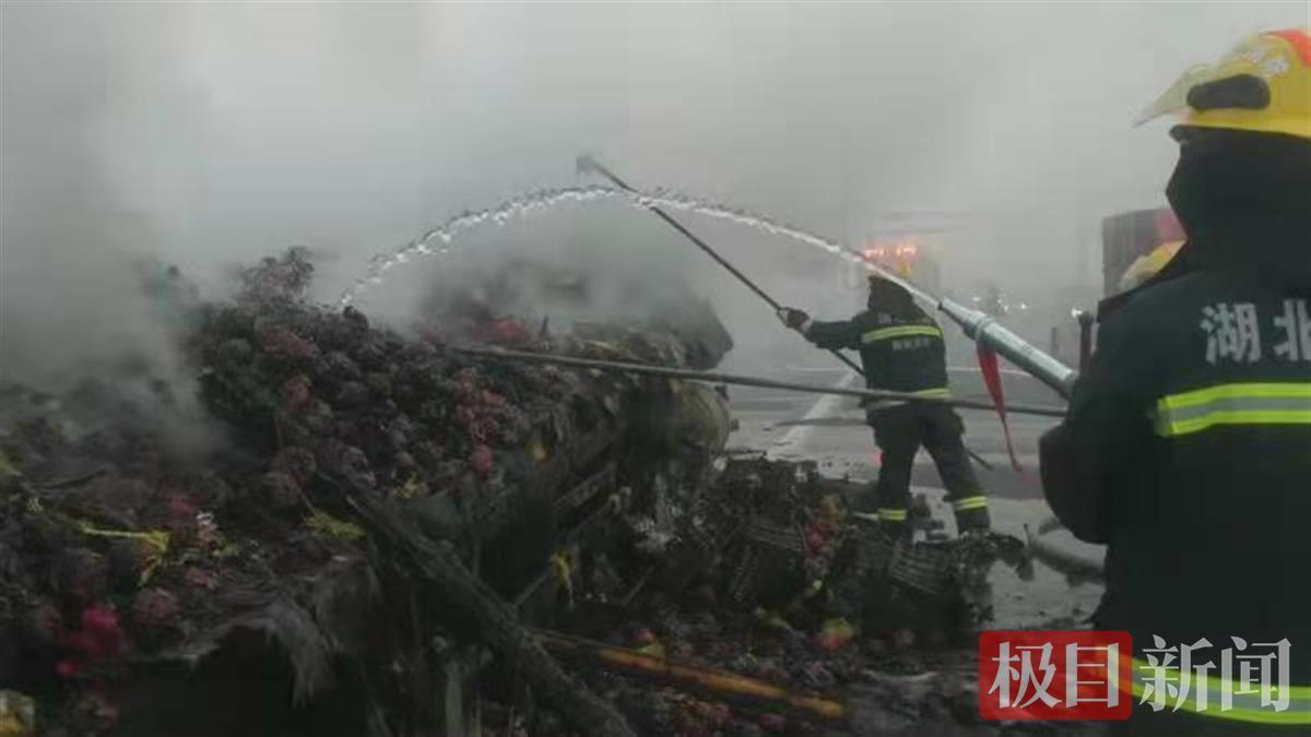 1月3日15时许,武监高速洪湖段一辆装载16吨火龙果的大货车意外着火。