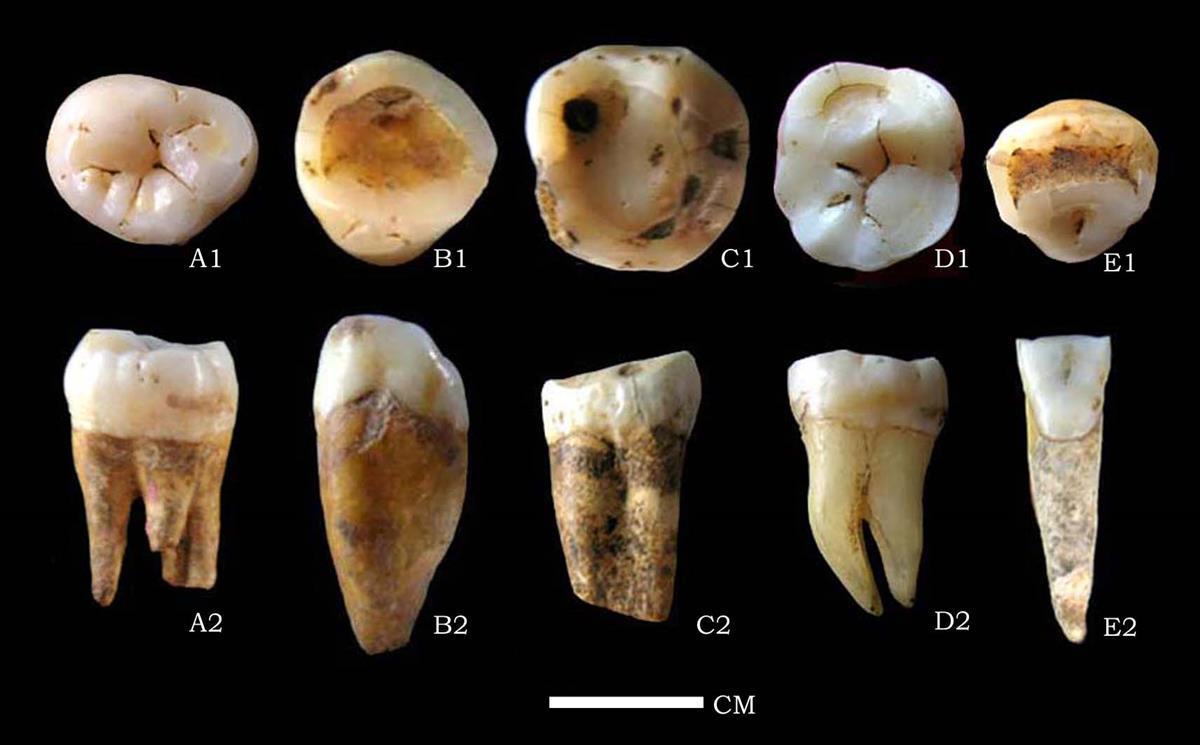 图为:黄龙洞遗址出土人牙化石