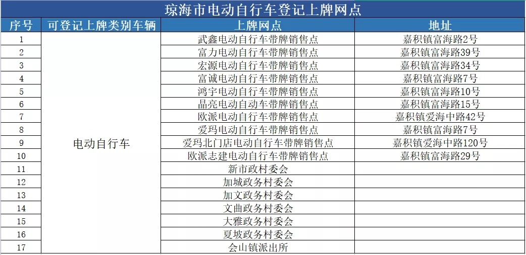 琼海市电动自行车登记上牌服务网点