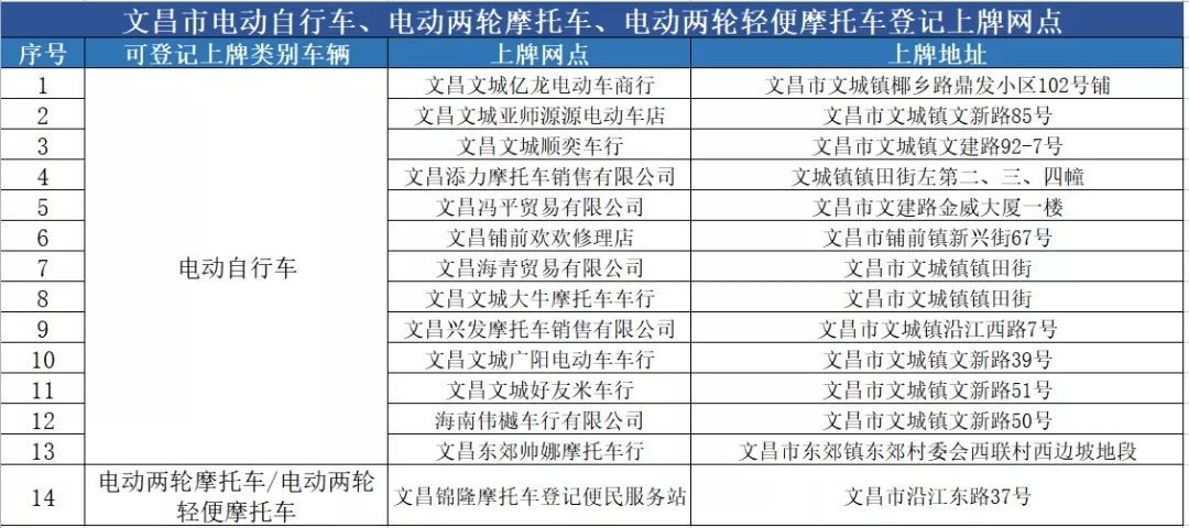 文昌市电动自行车、电动摩托车、电动轻便摩托车登记上牌服务网点