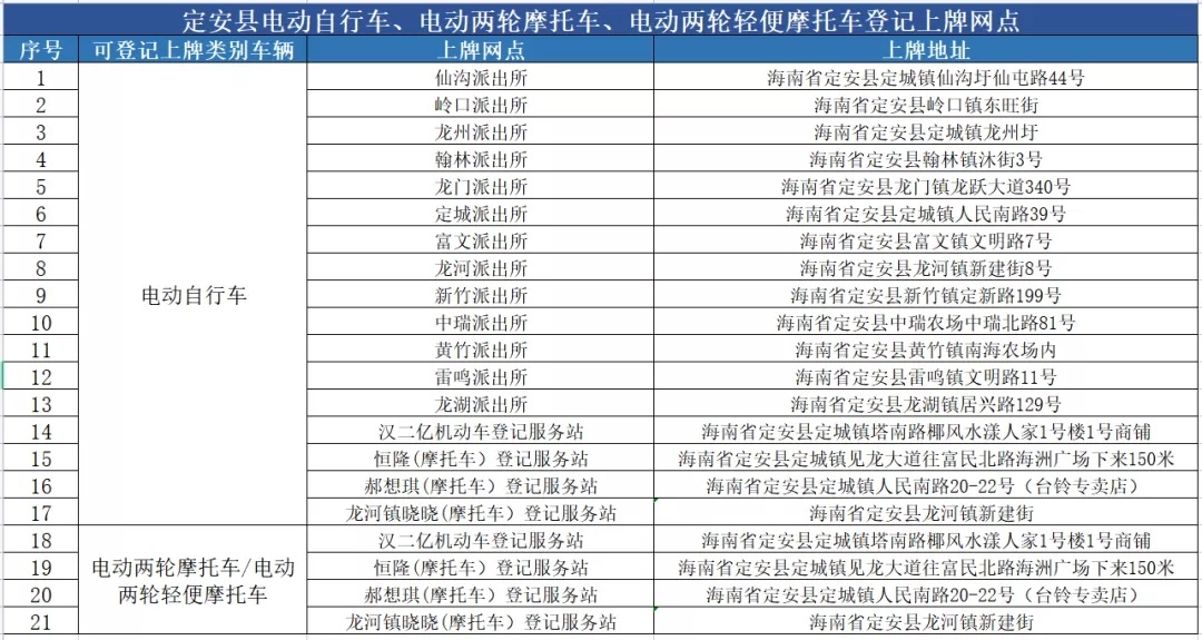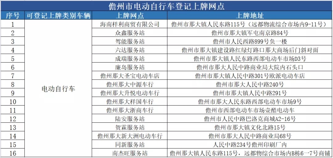儋州市电动自行车登记上牌服务网点