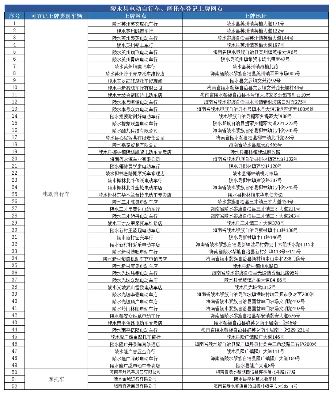 陵水县电动自行车、摩托车登记上牌服务网点