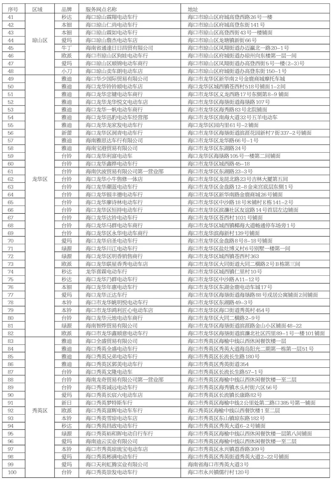 海口市电动自行车登记上牌服务网点