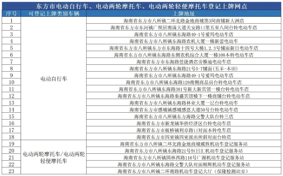 东方市电动自行车、电动两轮摩托车电动两轮轻便摩托车登记上牌服务网点