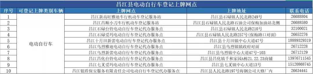 昌江县电动自行车登记上牌服务网点
