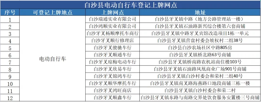 白沙县电动自行车登记上牌服务网点
