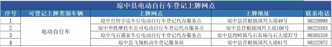 琼中县电动自行车登记上牌服务网点