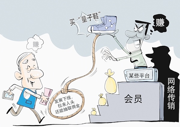 “网上买双鞋就能发展下线得佣金”“团队达到一定人数还有奖金”……一种新型传销模式正在网络上悄然发展。有别于线下限制人身自由的传销,这种网络传销可以“随进随出”,但参与者依然会因为贪图利益而深陷泥潭。(1月4日《北京晚报》)
