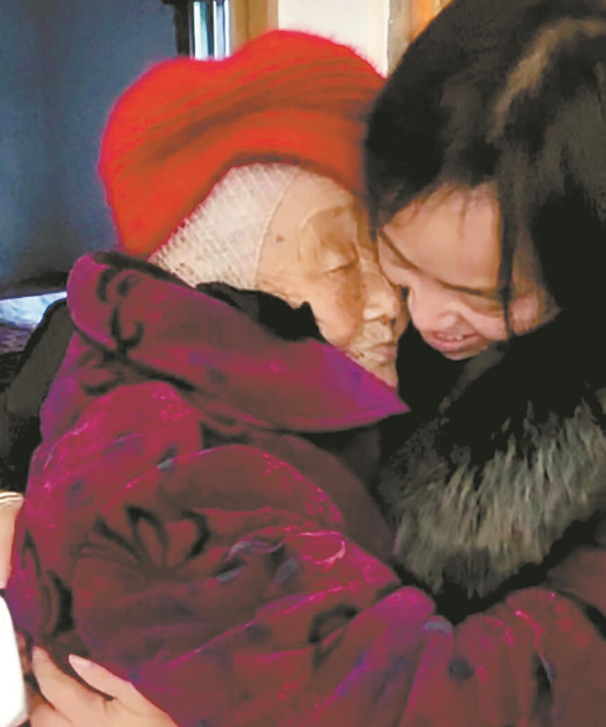 一辆小轿车沿着蜿蜒的村路前行,最后缓缓停在房前。一名头发花白的婆婆在子女们的搀扶下缓缓下车,走向路夏明。她正是78岁的李明英,是路夏明婆婆正在等待的女儿。两人一见面,便拉紧对方的手,洒泪相拥在一起。