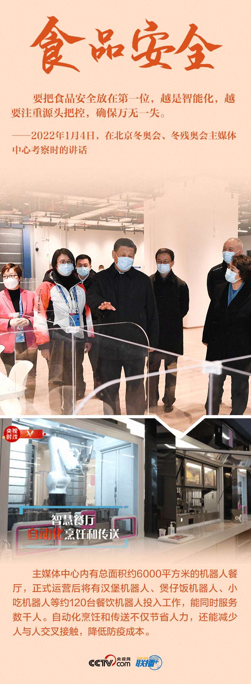 丨联播+丨“今天是元旦后上班第一天,我来专题调研北京冬奥会、冬残奥会筹备工作,主要是来给大家鼓劲加油。”1月4日,北京冬奥会开幕倒计时一个月之际,习近平总书记在北京深入体育场馆、媒体中心、训练基地等,实地了解2022年冬奥会、冬残奥会筹办备赛情况。