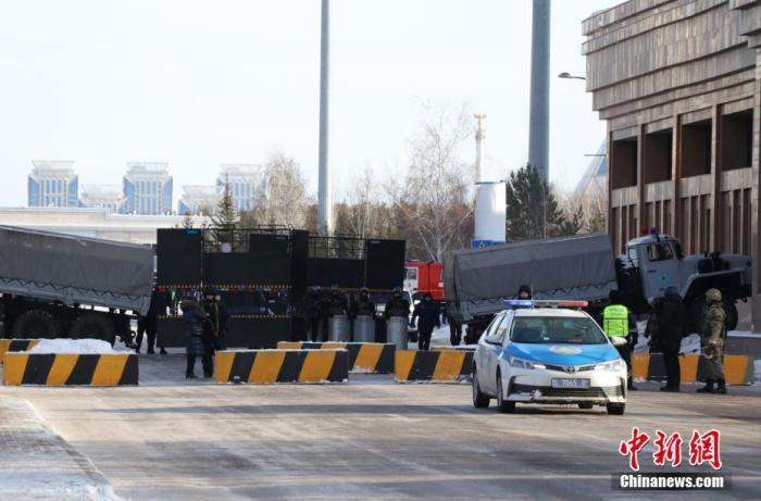 当地时间1月6日,在哈萨克斯坦首都努尔苏丹,总统府邸附近已由荷枪实弹的特种部队把守,多辆大型军用车辆围在建筑四周。 中新社记者 张硕 摄